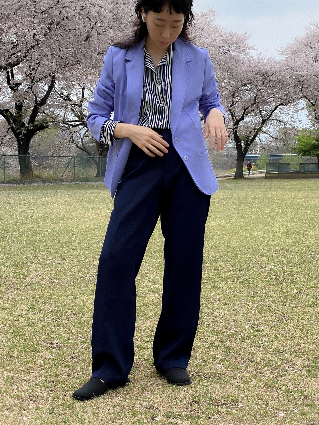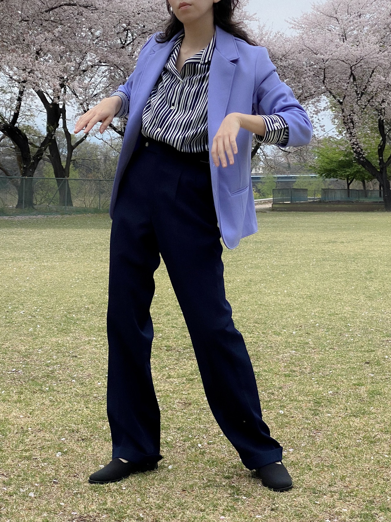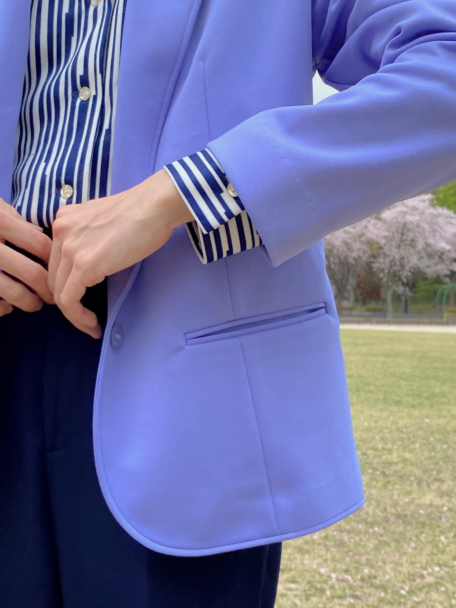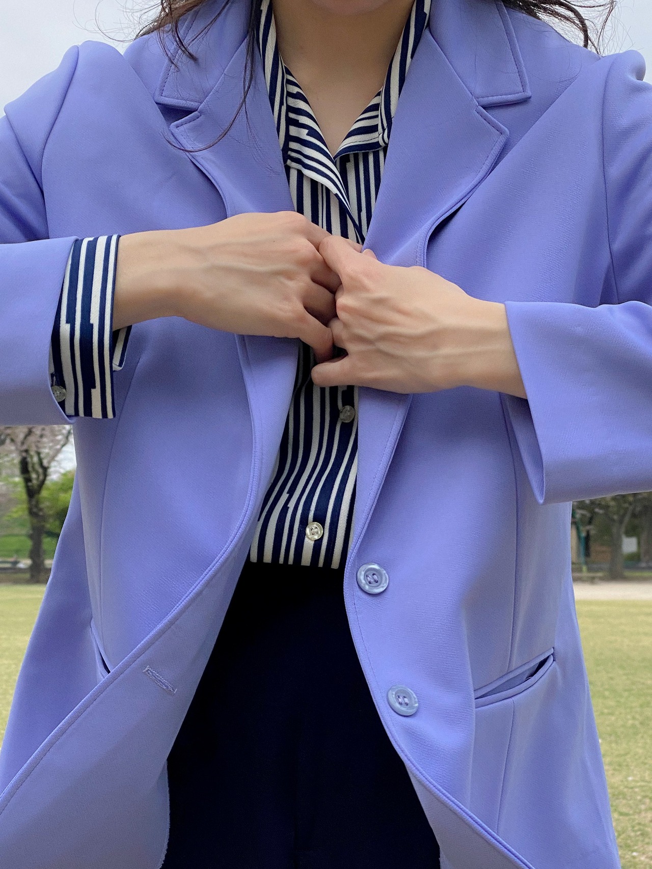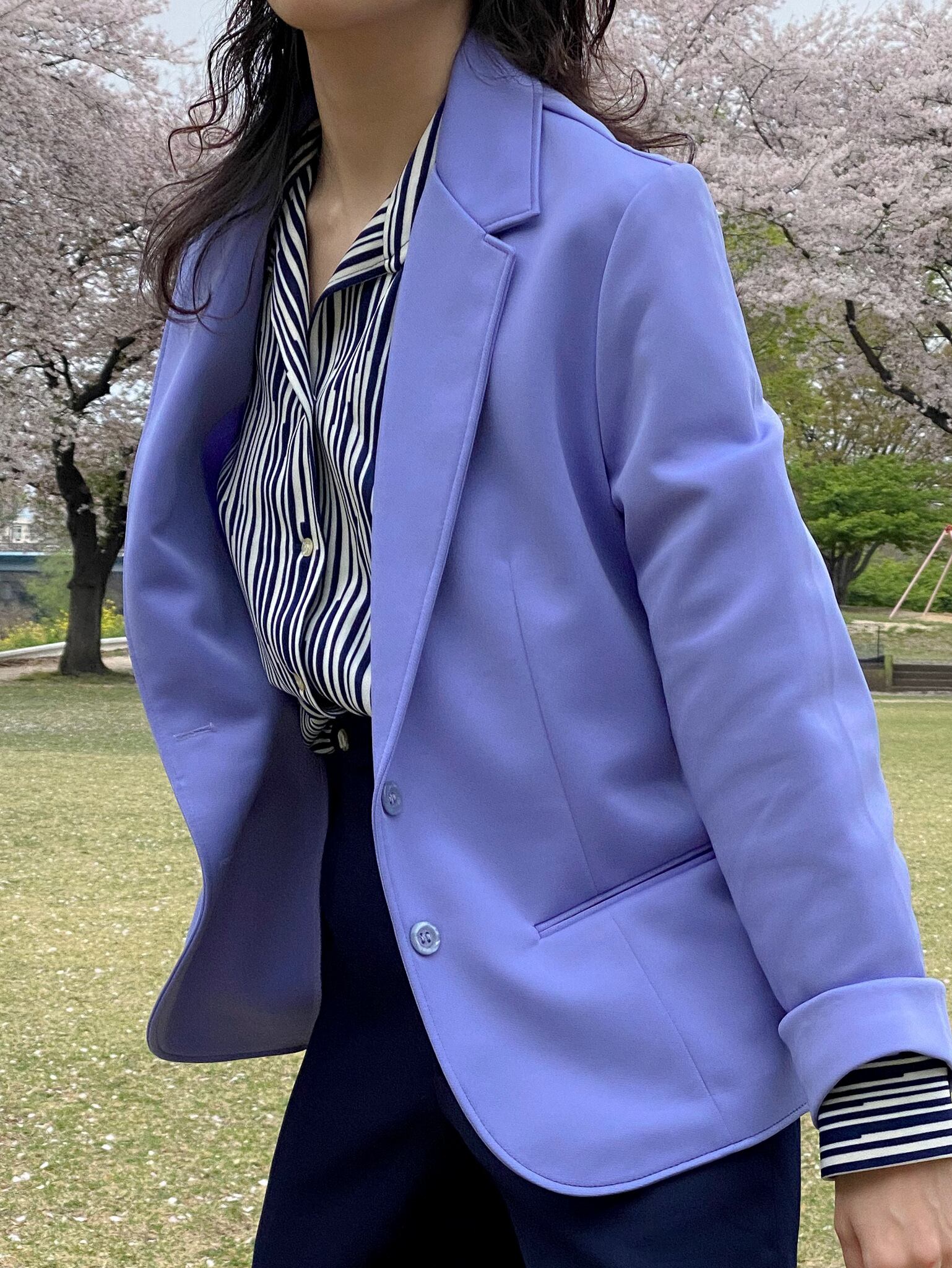 まずはパッと目に付くパープルは言葉にならぬ綺麗さで、適度な厚みで裏地なしのしなやかさ。ポリエステル素材なのに形はテーラードジャケットという、足したり引いたり自分次第でどんなコーディネートにもなりそうです。