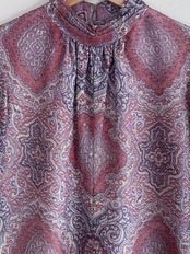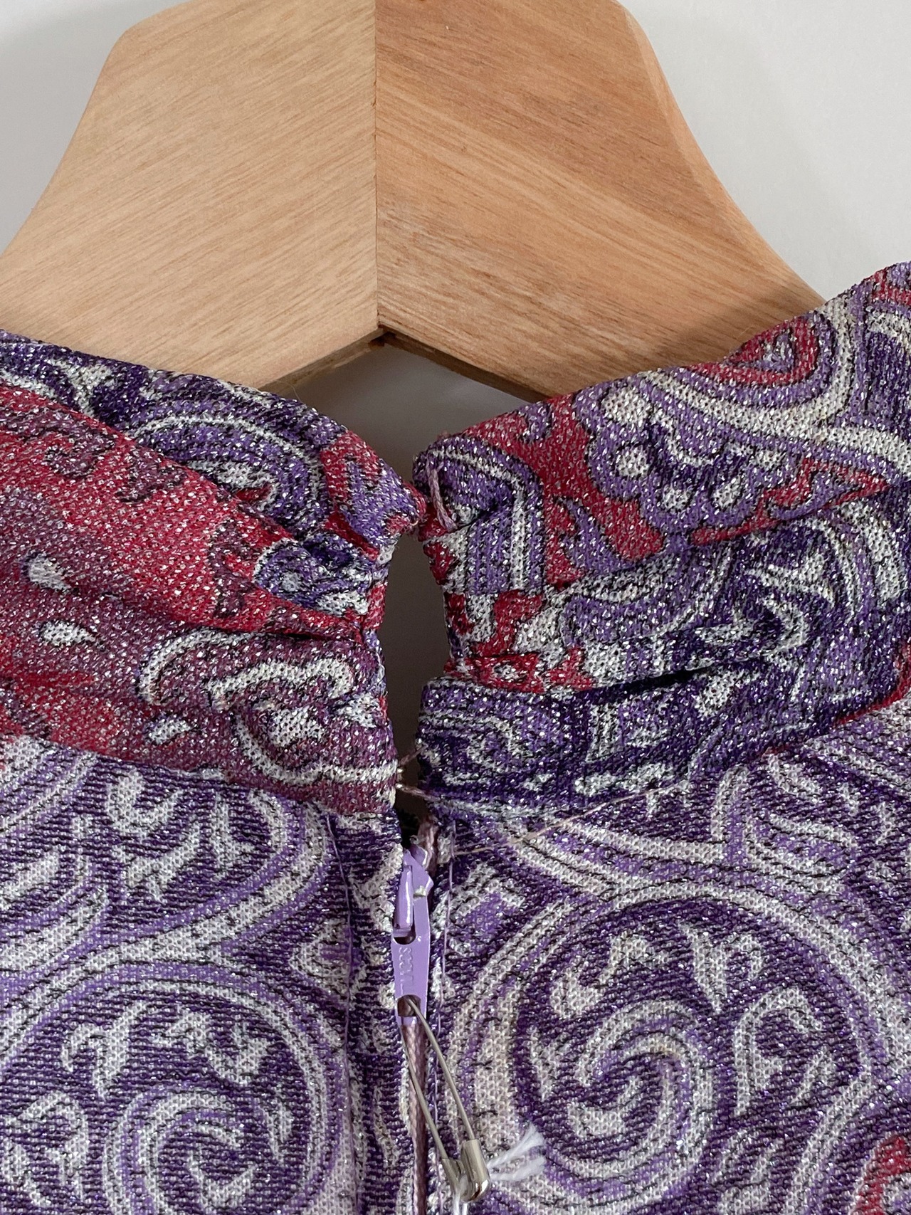 パープルカラーをベースに、ペイズリー柄にラメの入った生地は、まさに主役級。半身で切り替えているのですが、柄合わせが素晴らしく完全に反転しているように作られています。曼荼羅をみている様な、万華鏡から見えた柄をそのままドレスに落とし込んだ様な。