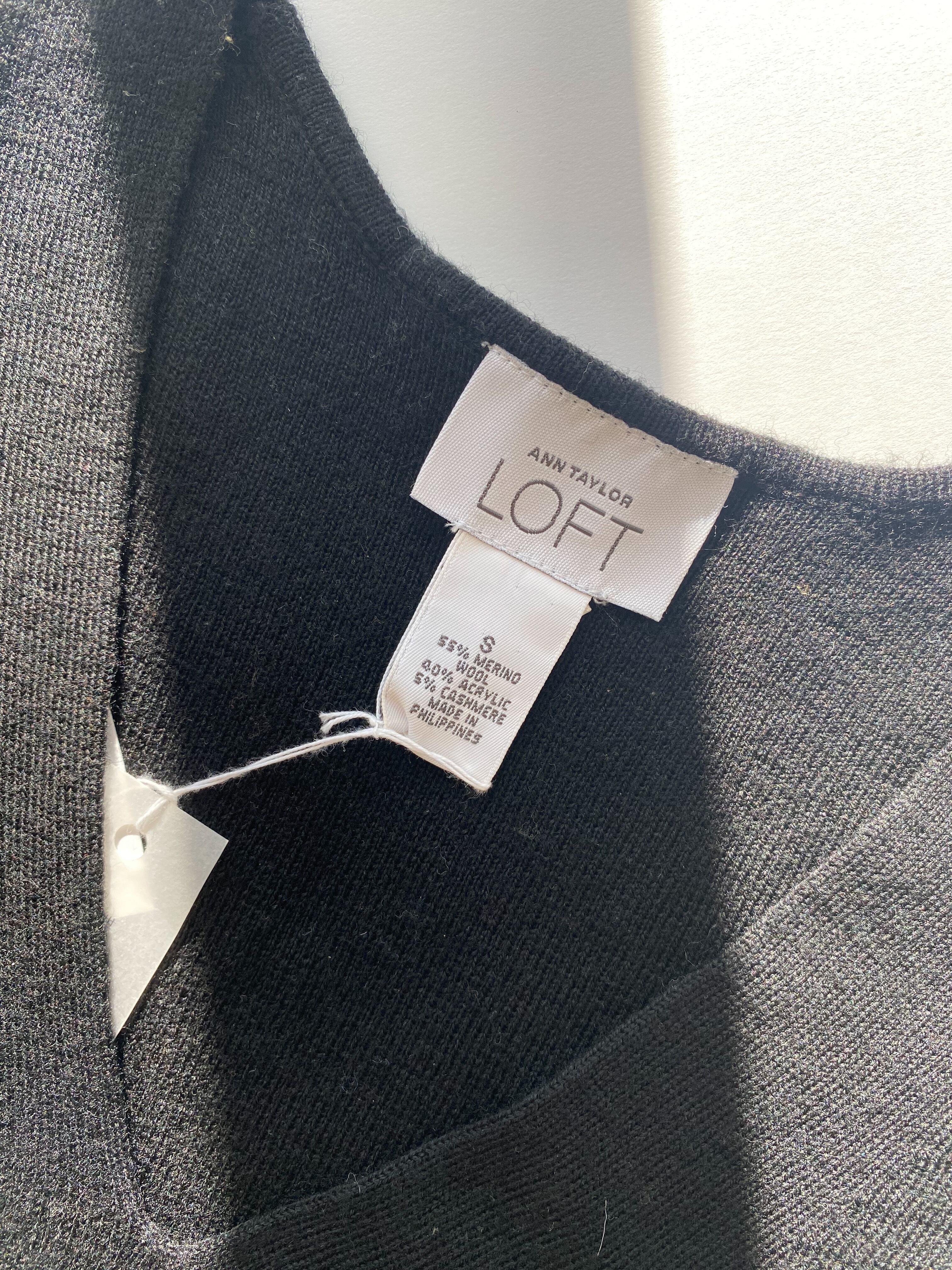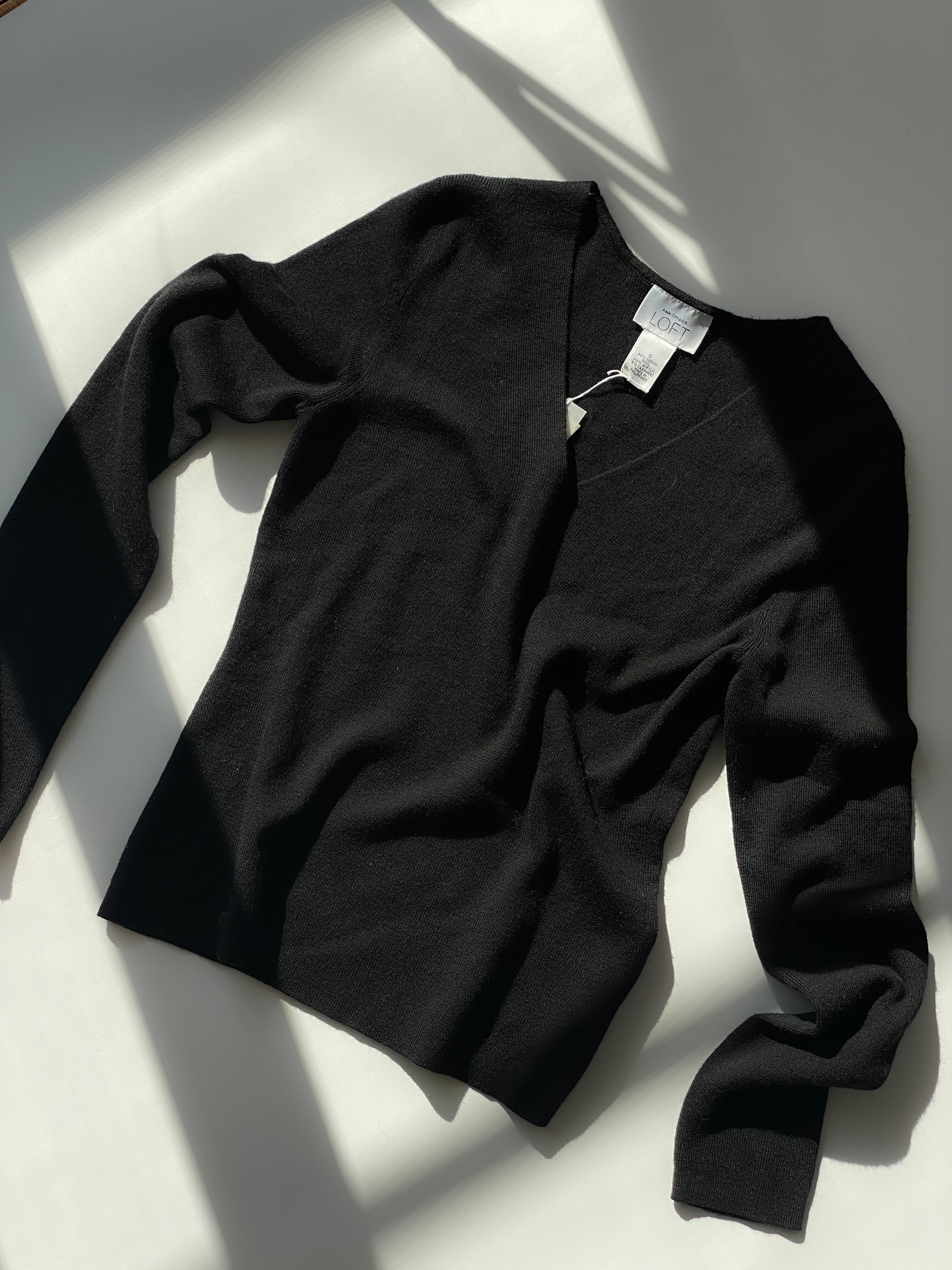メリノウールのニットトップス。シンプルながらVネックのカットが美しく、伸びすぎず適度な伸縮性が体に沿ってくれます。